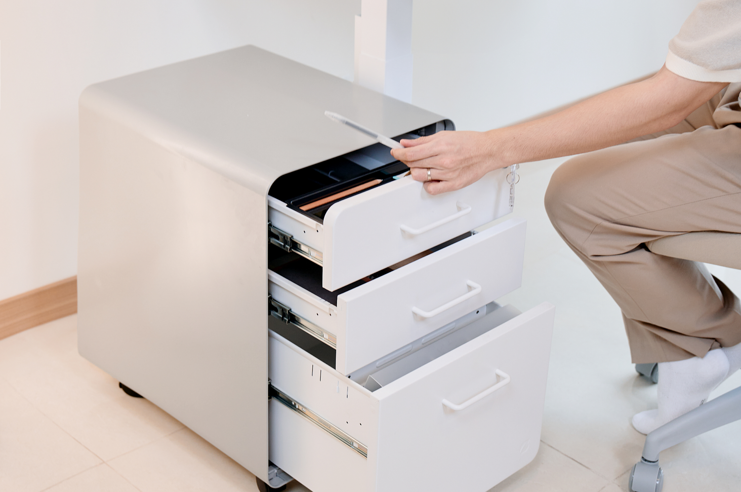 Mình đánh giá cao về thiết kế của hộc tủ bởi tính linh hoạt. Có thể di chuyển dễ dàng nếu cần thay đổi góc làm việc. Không gian 3 ngăn lưu trữ cực rộng rãi. Đặc biệt, có ổ khoá bảo mật, bảo vệ tài liệu quan trọng. Điểm đáng giá nhất là các chi tiết đều bo góc an toàn. Sau này Cue và Cam lớn, mình cũng đỡ lo 2 bé va đập chấn thương.