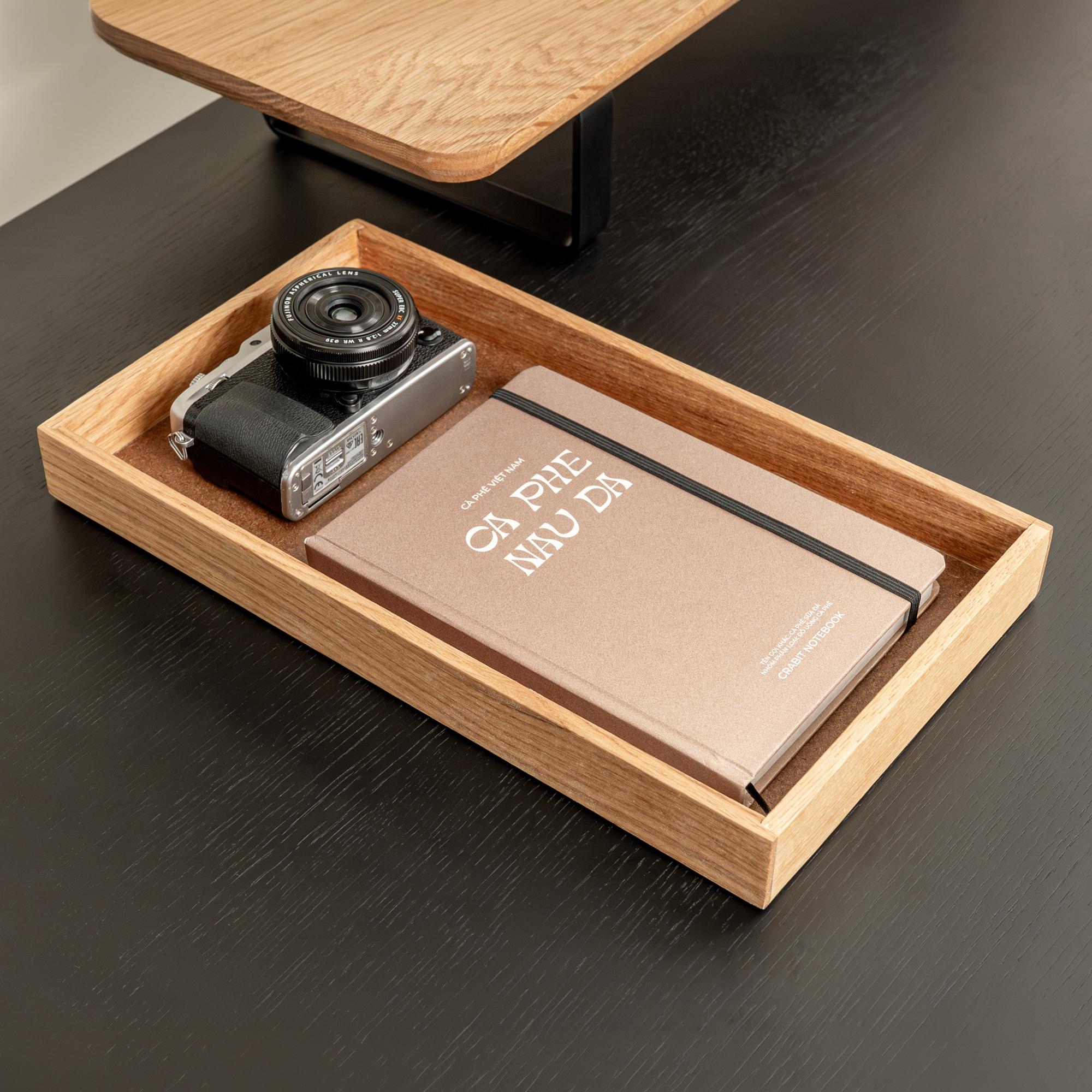 Sản phẩm sử dụng thân gỗ Sồi / gỗ Óc chó tự nhiên, đáy PB ổn định và đế khay lót cork chống trượt, mang lại trải nghiệm sử dụng chắc chắn, êm ái và bền bỉ. Hệ khay modular với nhiều kích thước cho phép ghép linh hoạt hoặc đặt gọn dưới desk shelf, giúp tối ưu không gian làm việc theo chiều dọc và giữ mặt bàn luôn thoáng đãng.